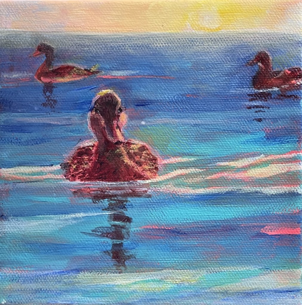 In the morning, the glow of the pink light shines on the ponds of Beaumont and these cute ducks are heard enjoying the warmth setting in the air. Painted on wide gallery canvas so that it can be placed on a bookshelf or hung!
